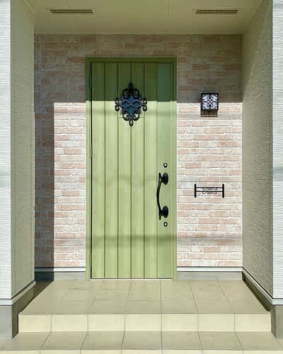 ライムグリーンの玄関ドアの格子と