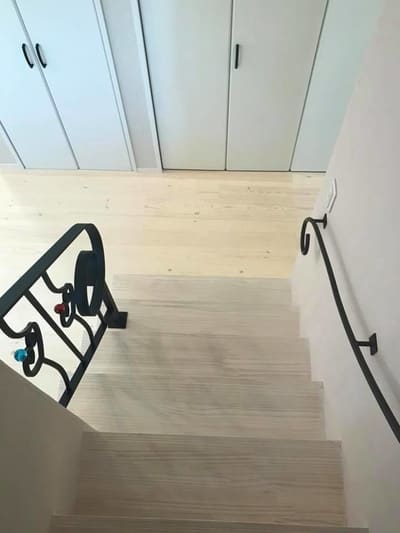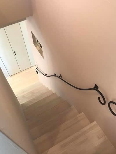 この壁手摺の壁面は薄いピンク色の塗り壁になっていて、