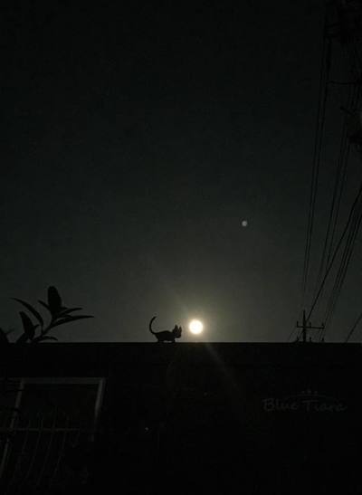 ブルーティアの屋上にいる、猫のブルーと月