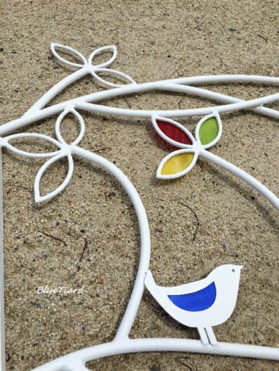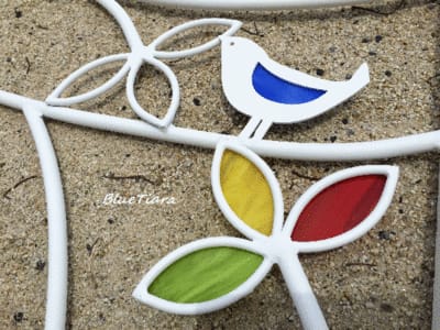 そこに小鳥を止めて、羽には青いガラスを入れました