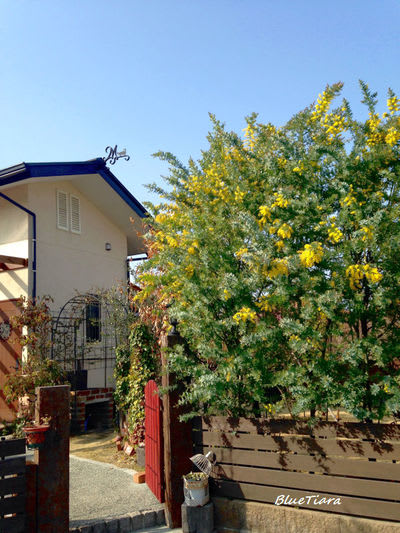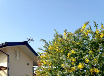 メイちゃんと一緒に、青空の元、ミモザが綺麗