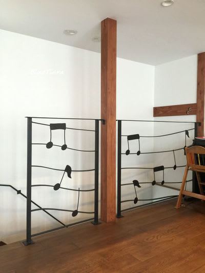 木製の柱の両側に、ゆるかやか曲線の五線譜の手摺がございます