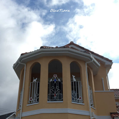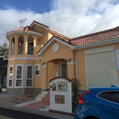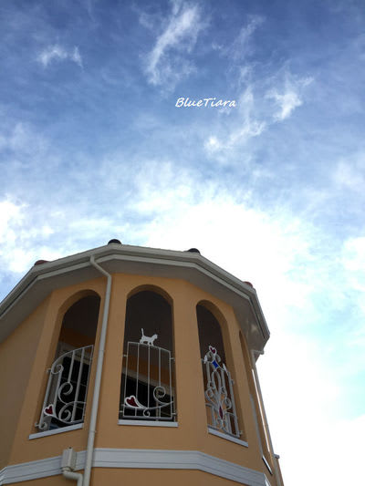 青空に黄色い外壁に、白いこのフェンス