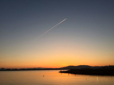 朝日と、飛行機、釣り人に、飛び立つ鳥も