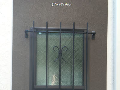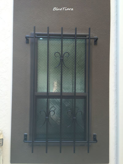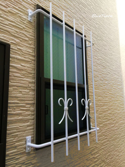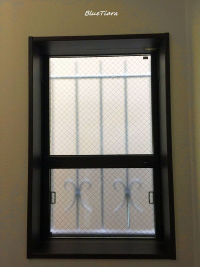 1階の道路からよく見える窓に3個のリボンある全面の格子