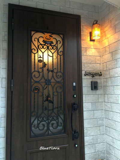 玄関ドアのアイアン風な面格子、オレンジ色の照明