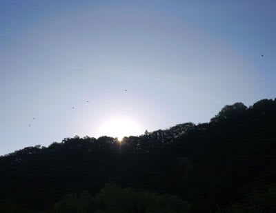 9月20日夕陽 岩手県花巻市内 木立に沈む太陽