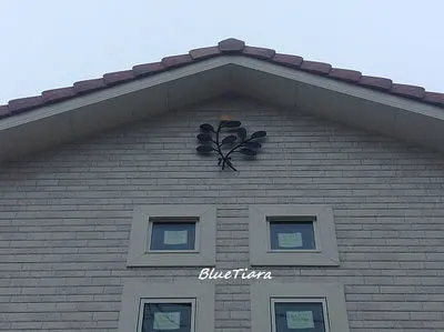 道路に面した妻壁に、2本のセージの葉の妻飾りが